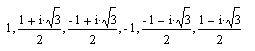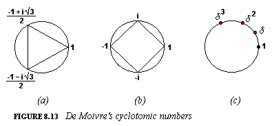 When the polygon is a square (Figure 8.13(b)), the answer is easy. The numbers (reading counterclockwise) are 1, i, - 1, -i. We call these the fourth-order De Moivre numbers. In a similar way, the third-order De Moivre numbers (Figure 8.13(a)) are 1, (-1+ i√3)/2, 1 - i√3)/2, and the sixth-order ones are these and their negatives: