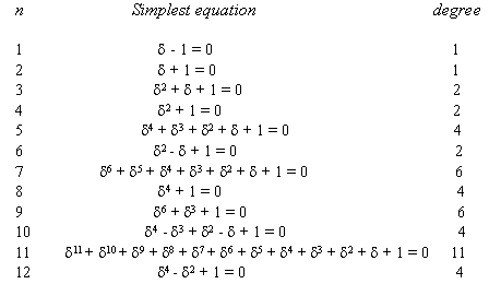 and we also see that δn = 1. But we saw that δ4 = i, which satisfies δ2 + 1 = 0, So δn = 1 is not always the simplest equation satisfied by δn. The following table gives the simplest equation for an for n = 1, . . . , 12.