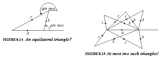 Suppose you have a triangle all of whose sides are rational numbers and all of whose angles are rational numbers of degrees. Then it must be equilateral! You might think that this was a very deep result, but in fact it's surprisingly easy to verify it, using De Moivre's numbers. Put your triangle in the complex plane (Figure 8.14). Then the angles indicated will be p nths and q nths of a revolution, where we take the smallest possible value of n. Since the three indicated shifts add up to zero, we see that the nth-order De Moivre number δ = δn must satisfy