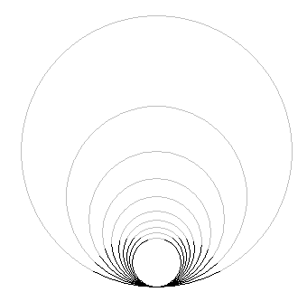 For large R (and a fixed range of t's), such a piece is small relative to the size of the circles and, hence, looks nearly as a straight line segment. For small values of R (near 1), the piece is closer to a complete circle.