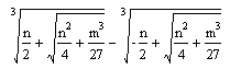 Rule to solve x3 + mx = n Cube one-third the coefficient of x; add to it the square of one-half the constant of the equation; and take the square root of the whole. You will duplicate this, and to one of the two you add one-half the number you have already squared and from the other you subtract one-half the same... Then, subtracting the cube root of the first from the cube root of the second, the remainder which is left is the value of x (Gerolamo Cardano, Ars Magna, 1545). |
